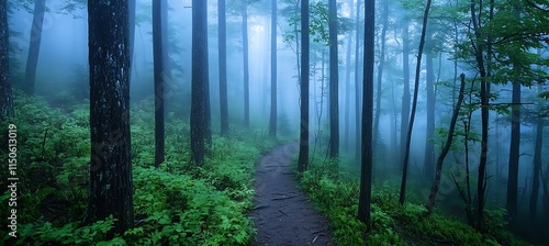 © Huzaifa, Fototapeta premium A morning in a foggy forest, with tall trees into the mist and the sound of birdsong