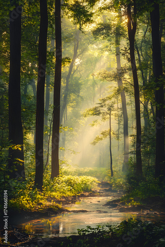 Naklejka premium A Morning in the EnchantedForest - The Serene Beautyof Sun-kissed Woodlands...