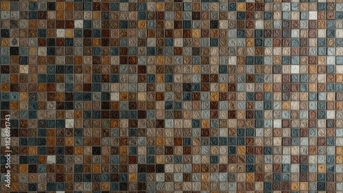 Fototapeta premium A mosaic of small square tiles in various shades of brown, beige, blue, and gray arranged in a grid pattern.