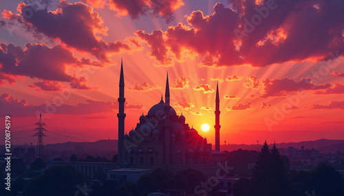 Fototapeta premium A mosque glowing under a fiery sunset sky, with its towering minarets standing tall, signifying the peaceful atmosphere of Ramadan.
