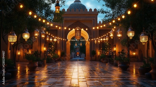 Fototapeta premium A mosque lit with lanterns, the call to prayer echoing through the air as people gather for Taraweeh prayers