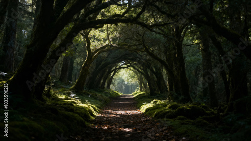 Naklejka premium A moss-covered forest path lined with arching trees forming a natural tunnel,...