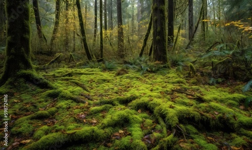 © Olga, Obraz premium a moss covered forest with lots of trees in the background. generative ai