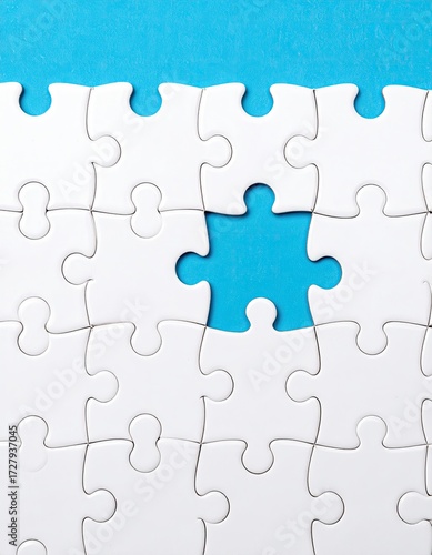 Fototapeta premium A mostly complete white jigsaw puzzle on a blue background with one missing...