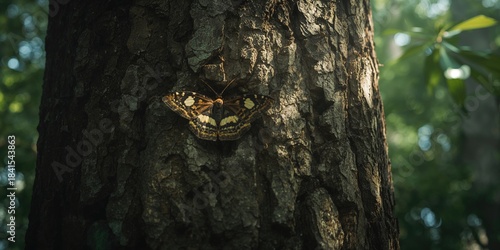 © AkuAku, Obraz premium A moth with cryptic coloration resting on bark, focus on camouflage techniques