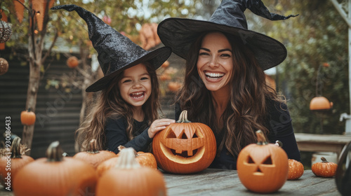 © Anna, Fototapeta premium A mother and daughter in witch costumes, smiling and carving pumpkins together outdoors, surrounded by jack-o'-lanterns and autumn leaves.
