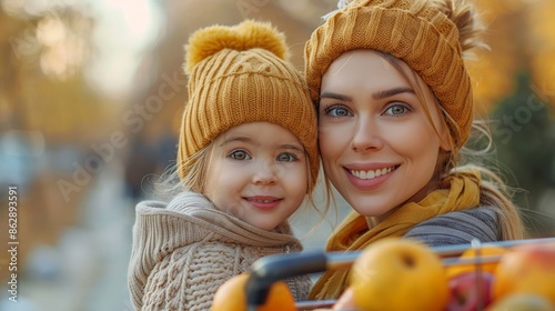 © nataliya_ua, Obraz premium A Mother And Daughter Share A Warm Smile While Shopping For Autumn Produce. Generative AI