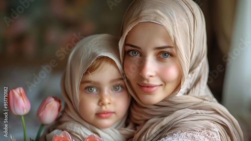 © amixstudio, Obraz premium A mother and daughter wearing matching headscarves, smiling warmly at the camera. The mother holds a bouquet of pink tulips, creating a soft and loving atmosphere. The background is softly blurred
