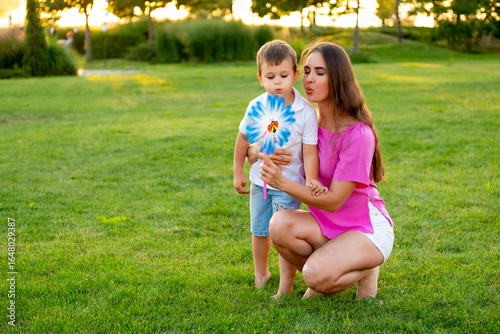 Fototapeta premium a mother and her child playing on a green lawn in the summer, having fun together, a mother and son walking together on a summer evening, playing a game, laughing and smiling