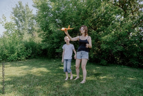 Obraz premium A mother and her son with hearing aids launch a paper airplane in a park, a heartwarming moment of inclusive play and bonding in nature. Perfect for disability awareness and family lifestyle content