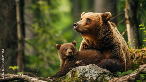 © liliyabatyrova, Obraz premium A mother bear and her cub are sitting on a rock in a forest