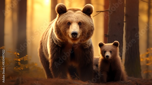 © santima, Fototapeta premium A mother bear and her cub in a forest setting.