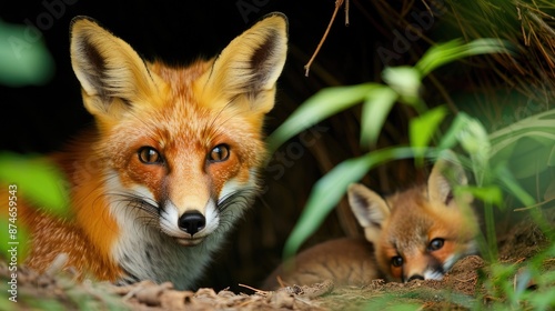 Fototapeta premium A mother fox and her cub resting together in their natural habitat,...