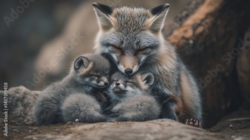 © BerkahStock, Naklejka premium A mother fox tenderly cradles her two sleeping kits amongst rocks.