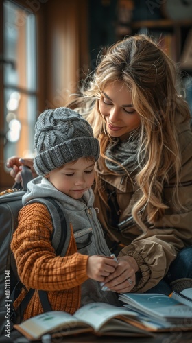 Obraz premium A mother helping her child pack a backpack for the first day of school. back...