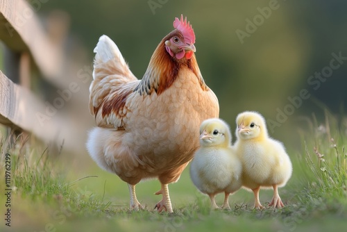 © mangolovemom, Fototapeta premium A mother hen walks proudly with her two fluffy chicks, surrounded by a lush green background, showcasing a peaceful farm life.