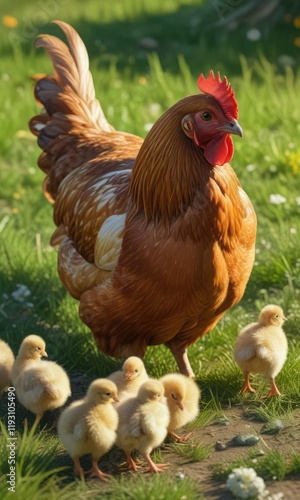 Fototapeta premium A mother hen watches over her chicks as they play and chase each other in the...