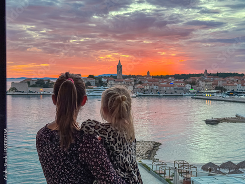© Chris, Naklejka premium A mother holds her young daughter while standing on a balcony to watch the vibrant red sunset over the historic skyline of Rab Old Town during a summer family vacation in coastal region of Croatia.