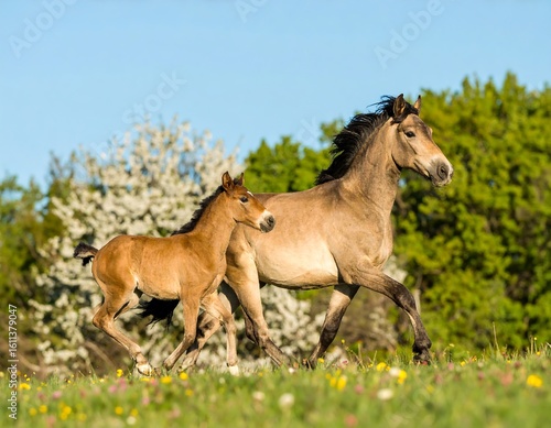 © Bapak, Obraz premium A mother horse and foal running in a field
