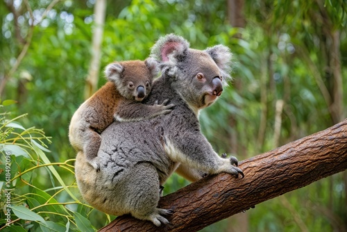 © Rakibul, Fototapeta premium A mother koala carries her baby joey on her back transparent background