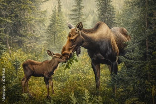 © arri, Fototapeta premium A mother moose gently touches her calf with leaves in forest