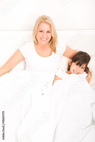 Fototapeta premium A mother relaxing in bed with her daughter..