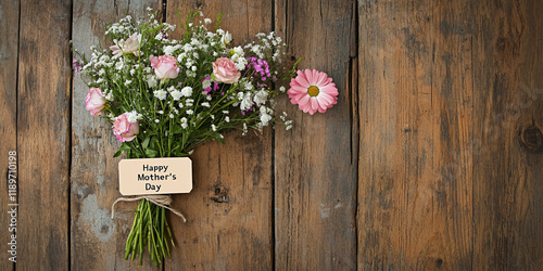 © Hassan Gallary, Fototapeta premium A Mother's Day Bouquet on Rustic Wooden Planks with Tag