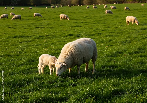 © Berta, Fototapeta premium A Mother Sheep and Her Lamb Grazing in a Lush Green Field Under the Warm Sun.