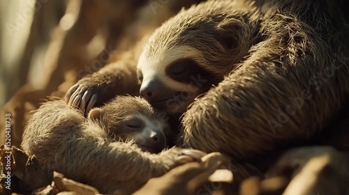 © BerkahStock, Obraz premium A mother sloth tenderly cradles her sleeping baby sloth amidst sun-dappled foliage.