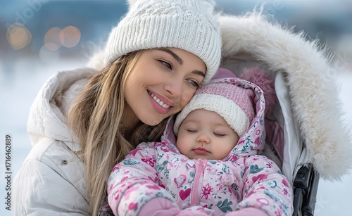 Obraz premium a mother, wearing white winter and holding her baby in a stroller, both...