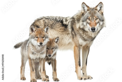 © Fotograf, Fototapeta premium A mother wolf surrounded by her two adorable cubs in a forest setting
