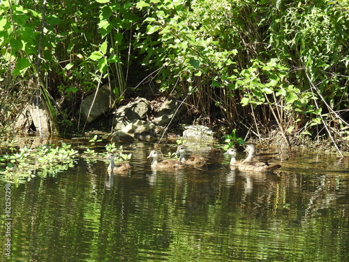 Fototapeta premium A mother wood duck and her baby ducklings swimming in the wetland waters of Wildwood Park, Dauphin County, Harrisburg, Pennsylvania.