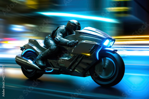 © piai, Fototapeta premium A motion blur of a robot driving a futuristic motorbike. Generative AI