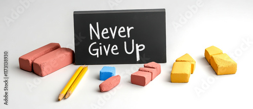 © F-STUDIO, Naklejka premium A motivational message displayed on a blackboard, surrounded by colorful chalk and a pencil, symbolizes perseverance and determination.