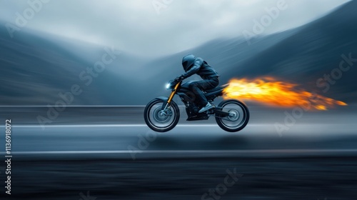 © Sergey, Fototapeta premium a motorcycle mid-jump with its front wheel on fire, leaving a fiery trail in the air