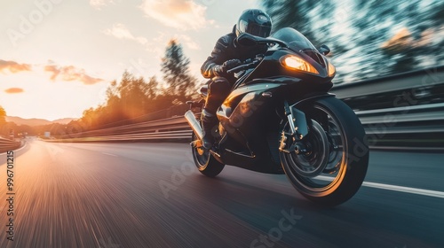 Fototapeta premium A motorcycle rider speeds down a road at sunset, creating a blur of motion.