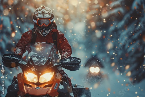 © Larisa AI, Fototapeta premium A motorcyclist with a snow-covered helmet rides through snowfall, with the bike's headlights on for visibility