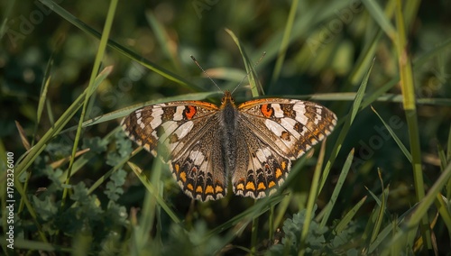 Fototapeta premium A mottled butterfly rests with its wings open on the grass, showcasing...