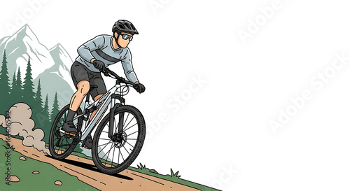 © Kino Studio, Obraz premium A mountain biker descends a rocky trail amidst a scenic landscape, showcasing an active lifestyle and the thrill of outdoor adventures with mountains and forests in the backdrop
