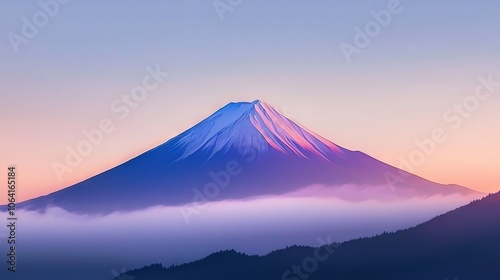 Fototapeta premium A mountain cloaked in fog, surrounded by a pastel sky and dotted with trees