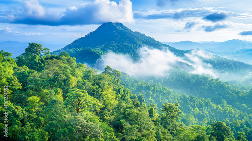 © Md Alamgir Artworks, Fototapeta premium A mountain covered in trees and fog with clouds, the sky is blue with white clouds, a photo of an alpine forest on top of a mountain