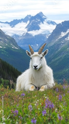 Obraz premium A mountain goat resting in a colorful meadow with a stunning mountainous...