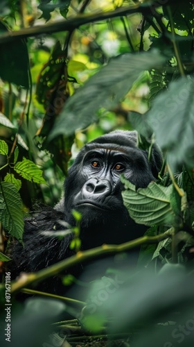 © Salsabila Ariadina, Obraz premium A mountain gorilla peeks out from behind leafy branches