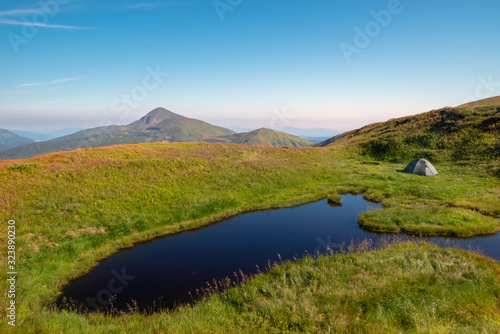 © fotolesnik, Fototapeta premium A mountain lake near which a tourist tent is set against the backdrop of the Hoverla mountain. Mountain landscape.