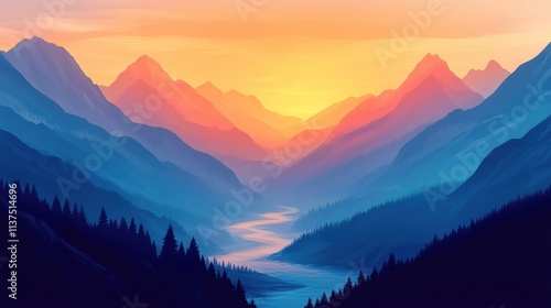 © BlackCat, Obraz premium A mountain landscape at dawn with grainy gradient hues of orange and blue, featuring a river flowing through the valley