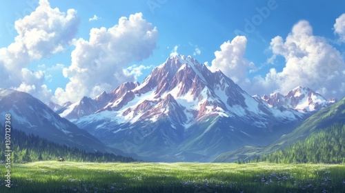 Fototapeta premium A mountain landscape with snow-capped peaks, soft clouds in the sky, peaceful...