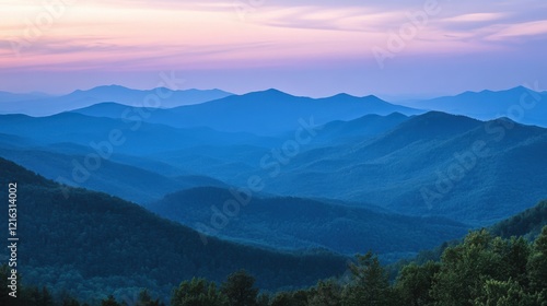 © Aranya, Obraz premium A mountain range at dusk, with the last rays of sunlight