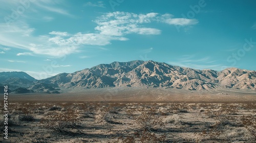 Fototapeta premium A mountain range stands in a desert's heart, surrounded by scant grass and bushes in the foreground The backdrop boasts a blue sky adorned