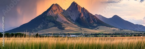 © Janis, Fototapeta premium A mountain range view with grass in the foreground and a town in the distance