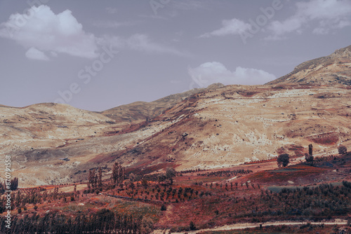 © oybekostanov, Fototapeta premium A mountain range with a cloudy sky in the background